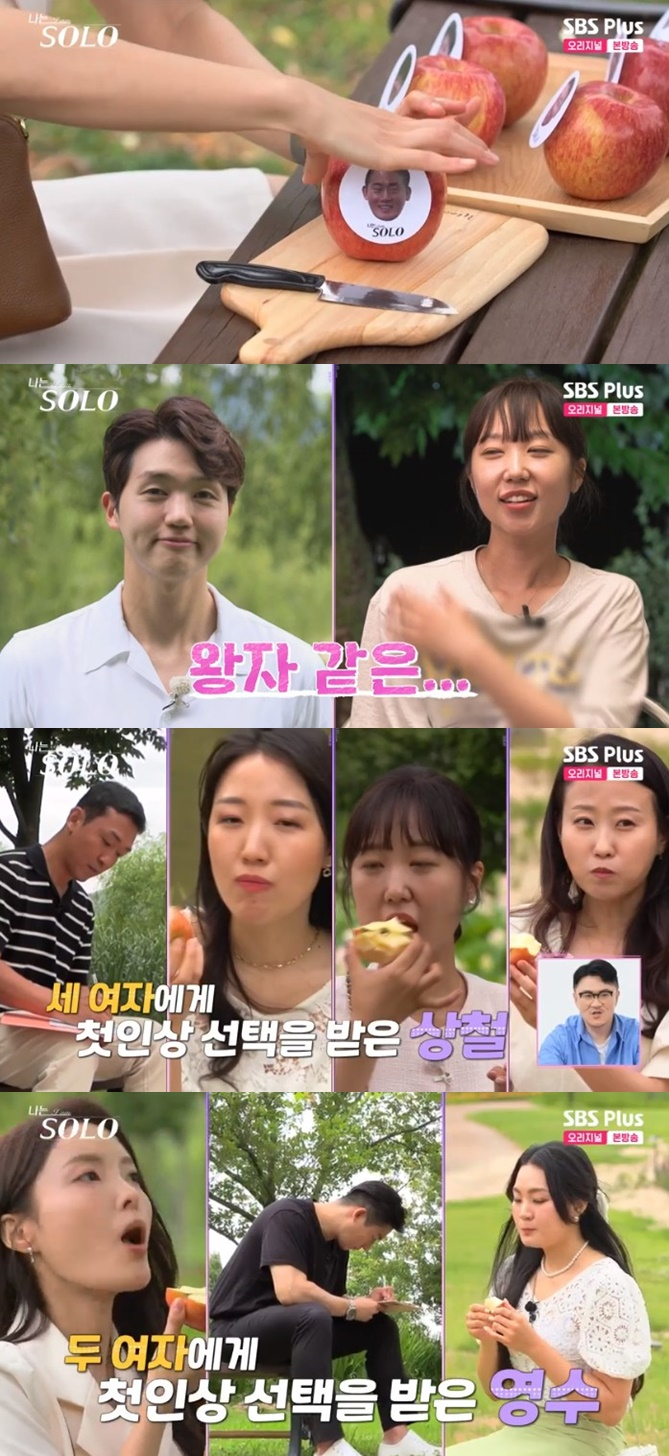 이날 방송에서 17기 여성 출연자들은 남성 출연자의 얼굴이 붙어있는 사과를 골라 베어 무는 방식으로 첫인상 호감 상대를 골랐다.