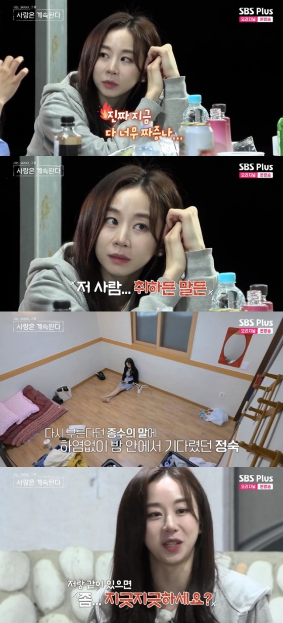 정숙은 '어떤 게 서운했냐'는 종수의 질문에 "나랑 같이 있으면 지긋지긋하냐. 아까 식사할 때도 그렇고 '빨리 가고 싶다' 이런 느낌이 들었다. 아까 저기서도 놀다가 갑자기 일 처리하고 영식님한테 얘기 나누러 간다고, 그러고 잠깐 있으라는 식으로 얘기했는데 다시 안 불렀지 않나. 기다렸다"고 속마음을 토로했다.