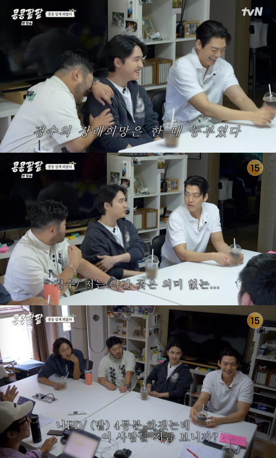 13일 오후 방송된 tvN 예능 프로그램 '콩 심은 데 콩 나고 팥 심은 데 팥 난다'(이하 '콩콩팥팥')에서는 나영석 PD와 이광수, 김기방, 도경수, 김우빈의 사전 만남 현장이 그려졌다.