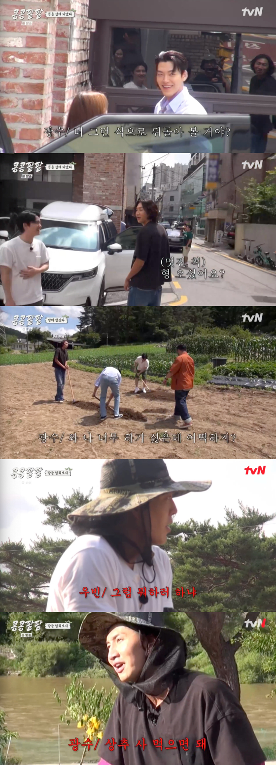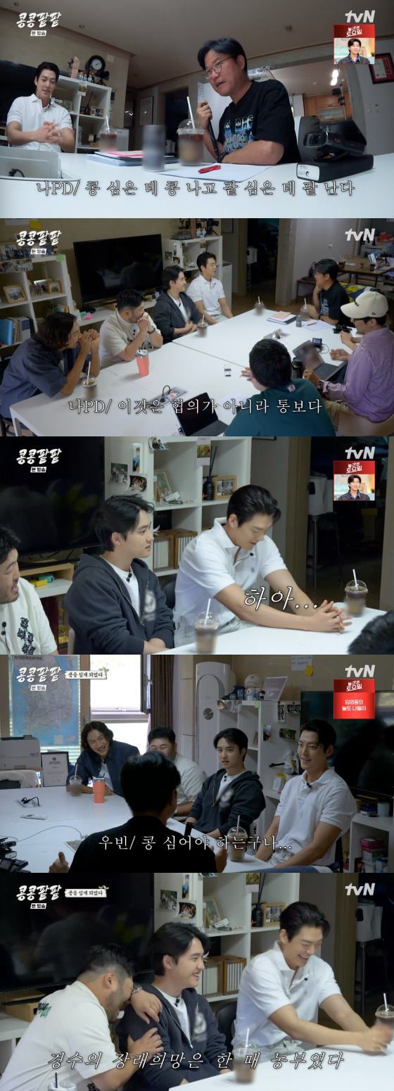 13일 오후 첫 방송된 tvN 예능 프로그램 '콩 심은 데 콩 나고 팥 심은 데 팥 난다'(이하 '콩콩팥팥')에서는 나영석 PD와 이광수, 김기방, 도경수, 김우빈의 사전 만남 현장이 그려졌다.