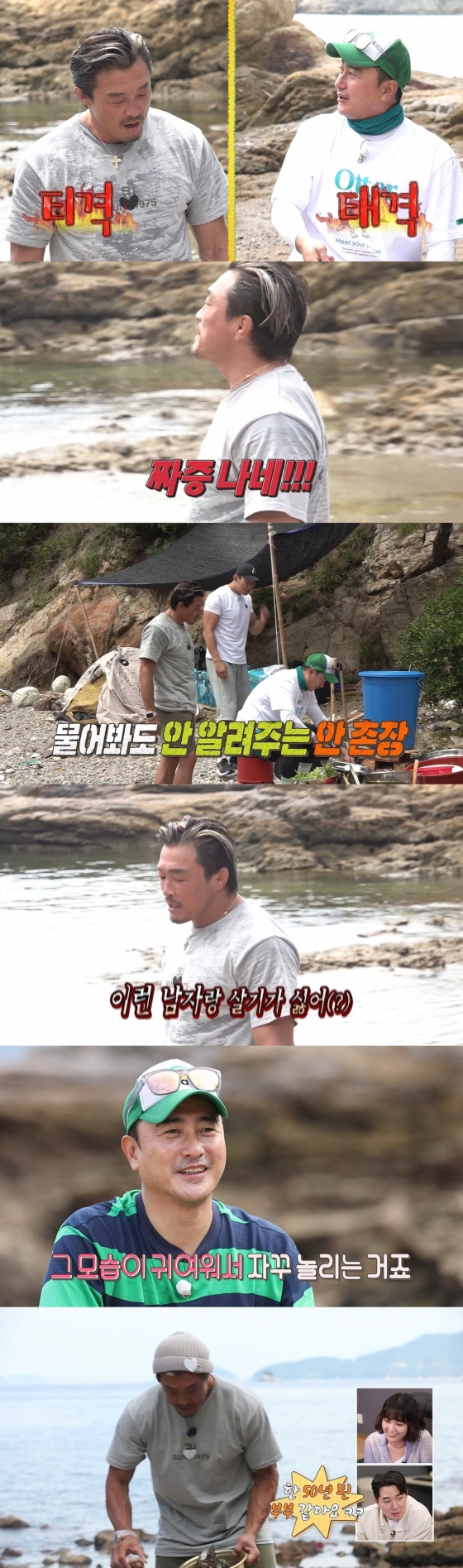 처음에는 서로를 존경한다던 두 레전드 운동선수 안정환과 추성훈이 무인도에서 역대급 유치한 케미스트리를 보여주고 있다. 이날 역시 두 사람은 티격태격 말싸움으로 하루를 시작한다. 먼저 일어나 아침 식사를 만들던 안정환이 메뉴를 물어보는 추성훈에게 대답을 안해주면서 살살 약을 올린 것. 이에 추성훈은 "짜증 나네"라며 분노한다. 급기야 그는 "이런 남자랑 살기 싫어"라는 투정 아닌 투정도 부린다고. 추성훈의 분노를 지켜보던 안정환은 "화내는 거 귀엽다"며 자신의 속마음을 고백해 웃음을 안긴다.