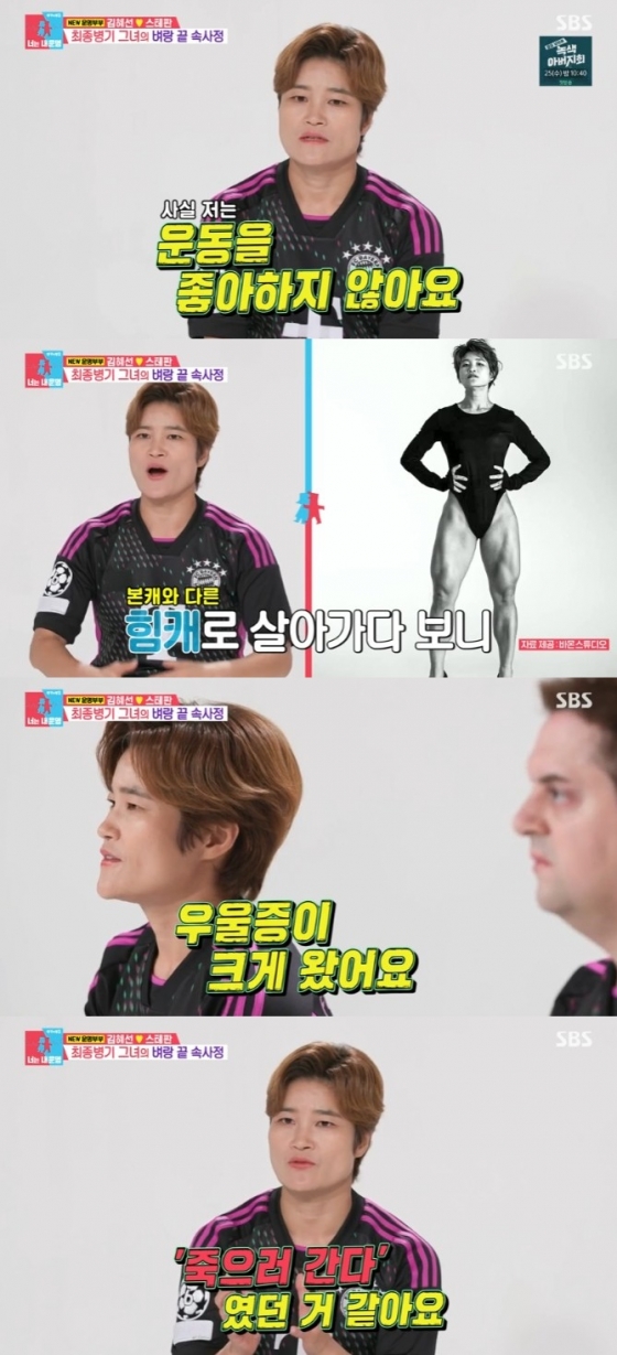 이날 방송에서 김혜선은 "사실 저는 운동은 정말 좋아하지 않는다"고 고백해 궁금증을 높였다. 그는 "개그맨 시험에 계속 떨어지다 보니 살아남을 수 있는 캐릭터가 뭘 지 고민해봤다. 몸 쓰는 여자캐릭터가 없어서 만든 캐릭터다"라며 운동을 열심히 하게 된 이유를 밝혔다. 그러면서 "운동을 안 좋아하는데 잘하니까 해야 하는 압박감이 있었다. 제 입으로 말하긴 그런데 여성스럽고 내성적인 면도 있다"며 조심스럽게 이야기를 이어갔다. 이어 그는 "그러면서 만들어진 모습에 괴리감을 많이 느껴 우울증이 크게 왔다"고 고백해 안타까움을 자아냈다.