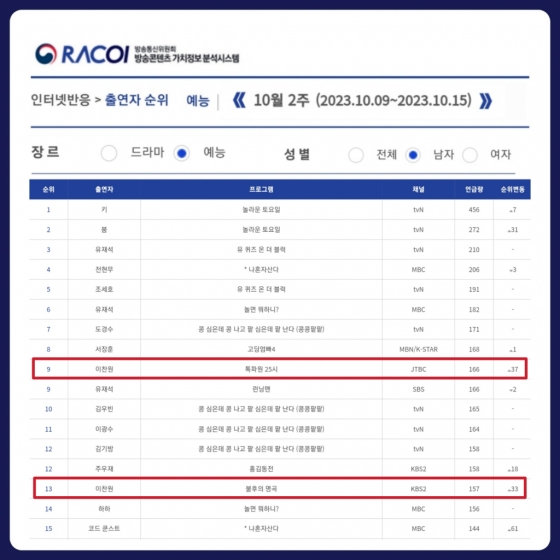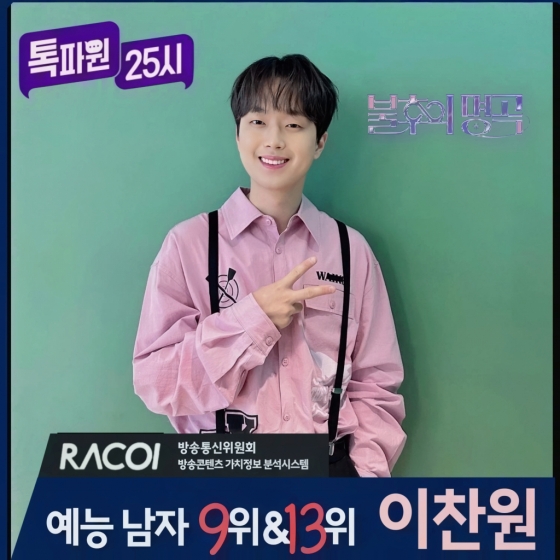 방송통신위원회 방송콘텐츠 가치정보 분석 시스템 RACOI에 따르면, 이찬원은 10월 2주(10월 9일~10월 15일) 인터넷 반응 분석에서 JTBC '톡파원 25시'로 남성 예능 출연자 9위와 KBS 2TV '불후의 명곡'으로 13위를 각각 차지했다.