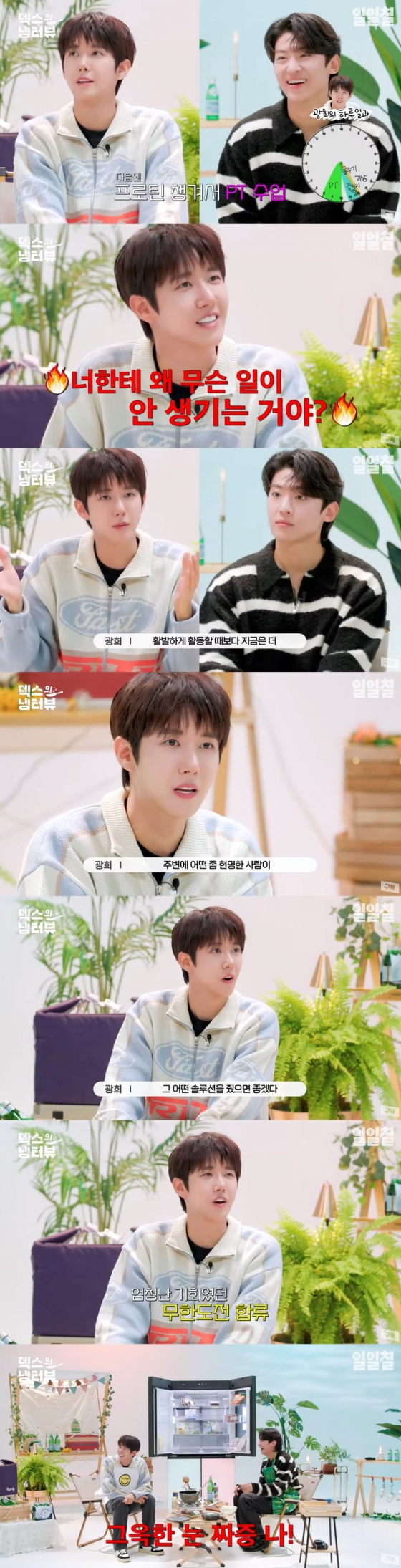 덱스는 "원래 '덱스의 냉터뷰'가 '광희의 냉터뷰'가 될 뻔했다는 소문이 있었다"고 깜짝 발언을 했고, 광희는 "(덱스가) 그 찰나에 치고 올라왔냐"라며 "저는 질투하는 대상이 두 명이다. 임시완은 고정이고 현재 아이코닉한 사람이다. 덱스가 2년 째인 거다. (덱스가) 최근에 명수 형이랑도 프로그램을 하더라. 아마 그 자리가 내 자리 아니었을까. 맵게 말하는 건 난데. 신경이 쓰이기 시작했다"라고 말했다.