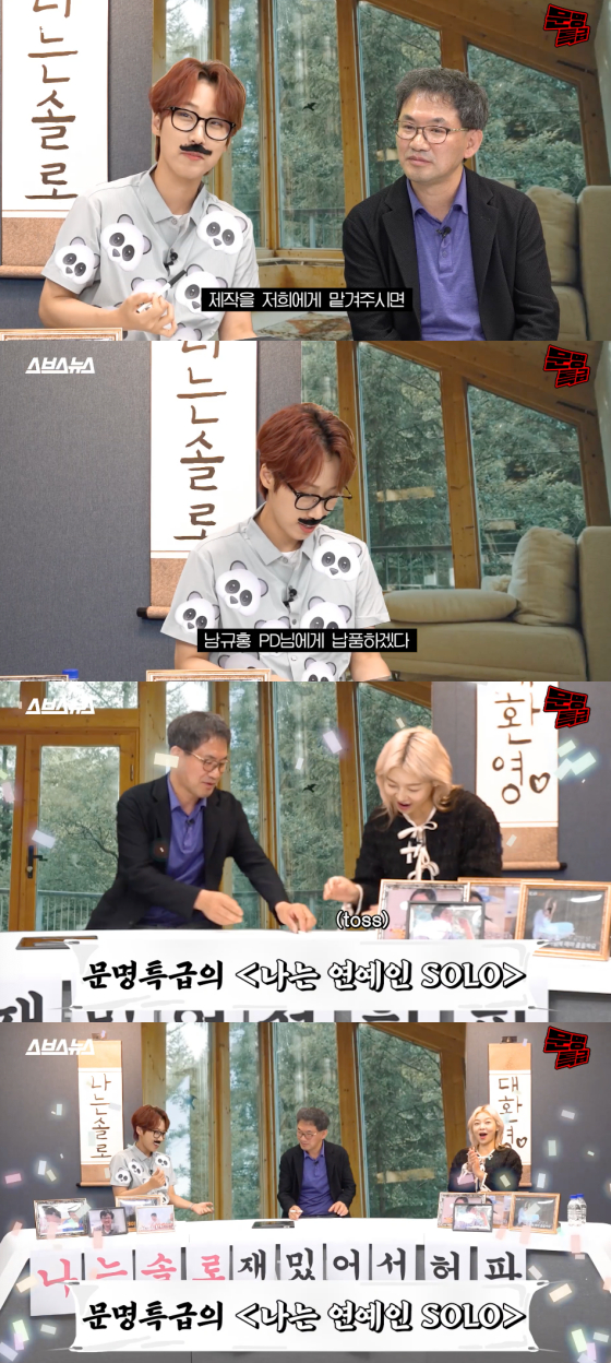 재재는 이때 결재 서류를 꺼내 눈길을 모았다. 재재는 "'나는 솔로' 외전 '나는 연예인 솔로', 줄여서 '나연솔' 제작을 저희에게 맡겨주시면 저희가 아무런 대가 없이 0원으로 남규홍 PD님께 납품하겠다. 그리고 송해나 씨는 저희와 함께 진행하자"고 말해 놀라움을 자아냈다.