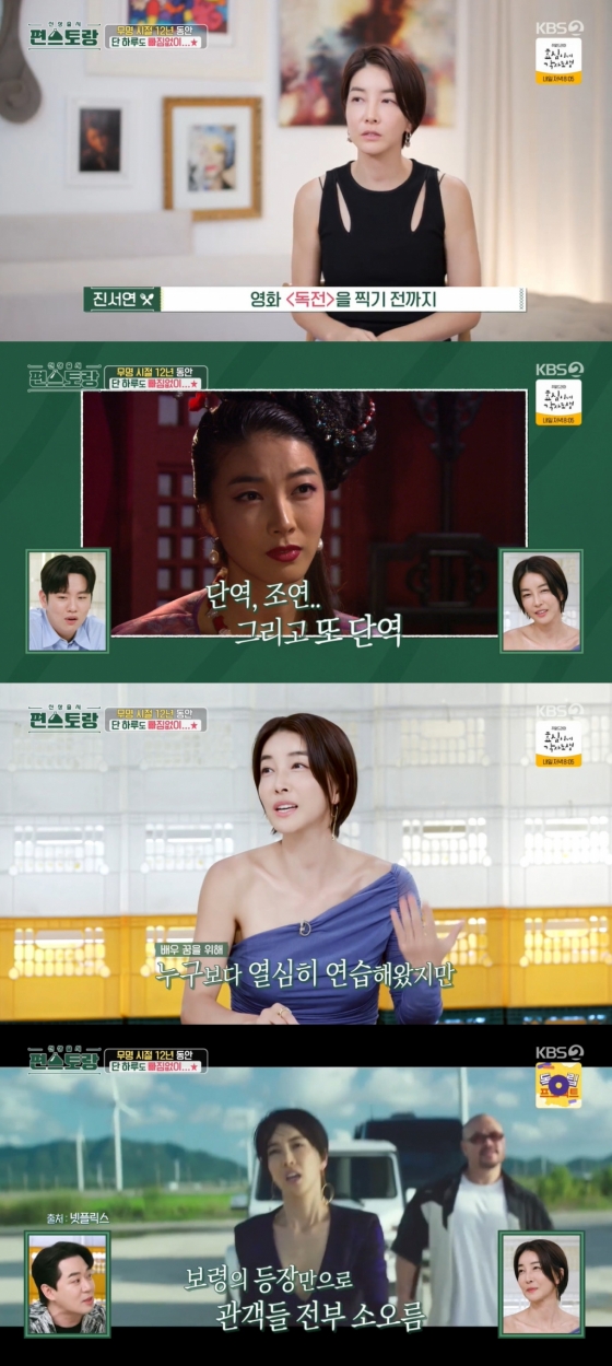 이날 진서연은 "영화 '독전' 할 때까지 12년 정도 발음 연습 독백 연습을 단 하루도 빼지 않고 2시간 씩 했다. 이렇게 열심히 안 하면 좋은 기회가 왔을 때 내가 못 잡을 거 같았다"라며 "10여년을 열심히 살았다. 난 되게 열심히 하는 타입인데 열심히 한다고 되는 일이 아니었다. 무명 시절이 길다 보니까 그만하자는 생각이 있었다"라고 털어놨다.