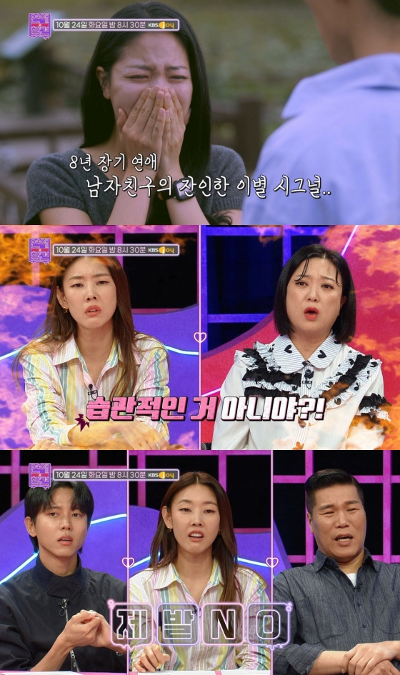 8년째 만난 남자친구에게 한 달 사이에 두 번이나 헤어지자는 소리를 들은 고민녀의 심정을 헤아리며 곽정은은 "내 존재 자체가 사라지는 느낌일 것 같다"고 말했고, 한혜진은 자신도 20대 때 8년을 연애한 경험이 있다며 이야기를 꺼냈다.