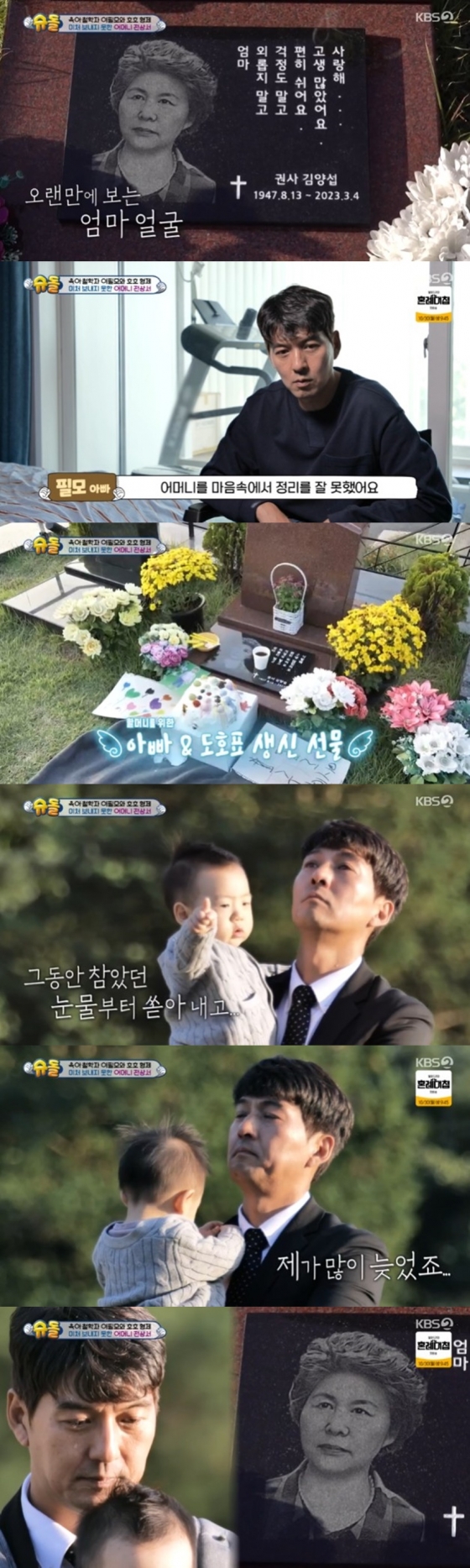 이필모는 도호, 담호와 함께 준비해온 선물을 비석 아래 내려놓고 생신 축하 노래를 부르며 눈물을 훔쳤다. 이어 이필모는 담호가 잠시 자리를 비우자 복받치는 감정에 소리 없이 눈물을 쏟아냈다. 이후 그는 어머니에 "담호가 준비한 케이크다. 엄마 생일인데 내가 일을 했다. 담호가 아직 잘 몰라서 놀이터 온 것도 아닌데 뛰어놀고 있다. 엄마를 닮아서 자연이 좋은가 보다"라며 찬찬히 이야기를 이어가 보는 이들을 먹먹하게 했다.