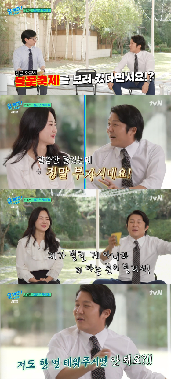이후 등장한 윤두연 차장은 이 소식에 "(불꽃축제) 행사장에 오셨냐"며 "부르주아시구나. 말씀만 들었는데 벌써 부자시다"라 감탄해 폭소를 유발했다. 조세호는 이에 "부르주아가 아니라 아는 분이 미리. 제가 빌린 게 아니라 아는 분이 빌려서 '혹시 저도 한 번 태워주시면 안 돼요?'라고 해서 탔다"고 변명해 웃음을 더했다.