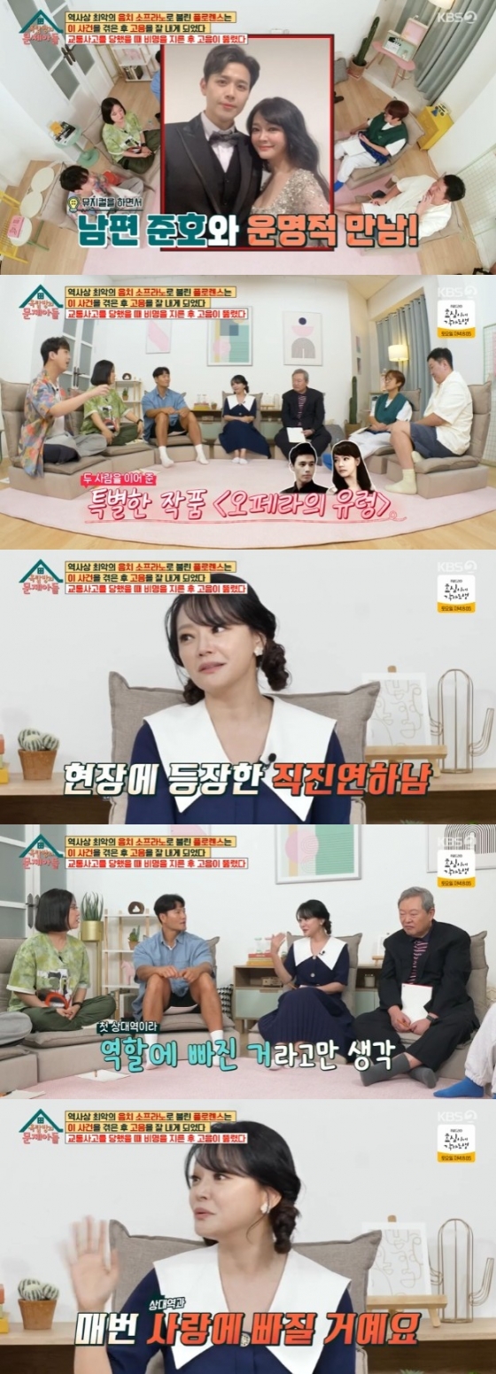 이날 방송에서 김소현은 남편 손준호와 뮤지컬 '오페라의 유령'에서 만났다며 "제가 2001년 중학교 때 '오페라의 유령'으로 데뷔를 했고 남편이랑 2010년에 두 번째 '오페라의 유령'으로 만났다"고 첫 만남을 회상했다.