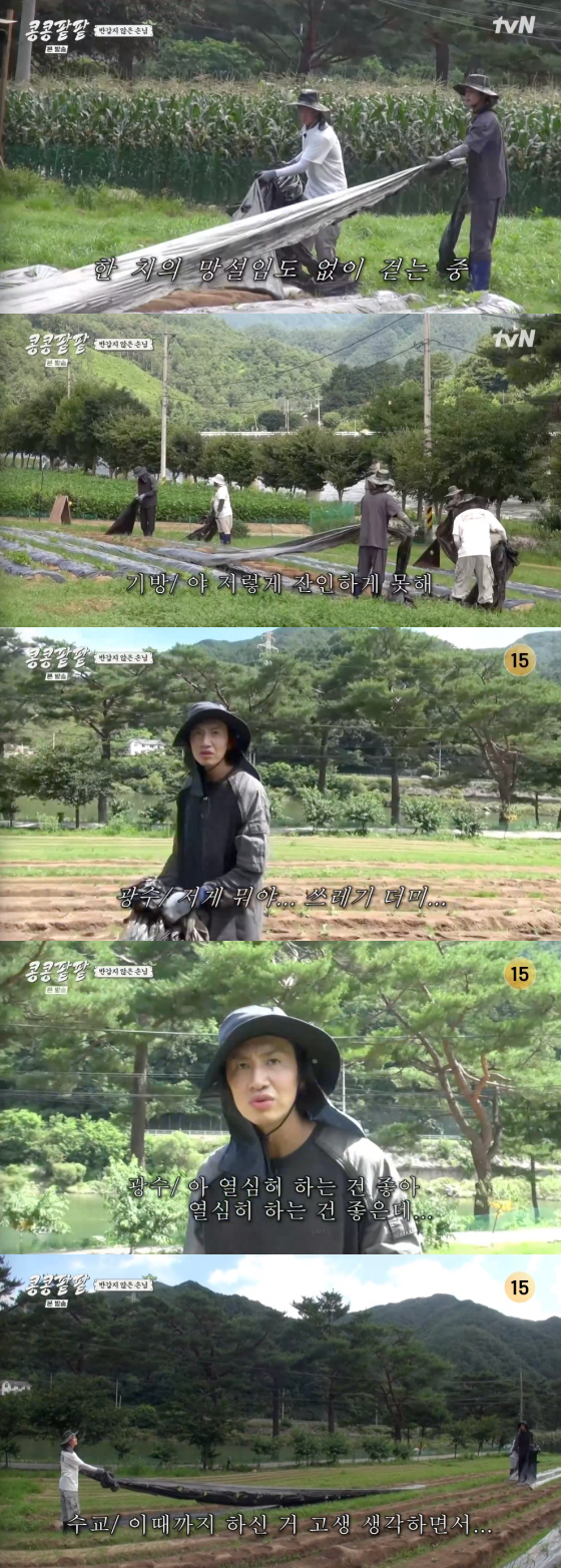 27일 오후 방송된 tvN 예능 프로그램 '콩 심은 데 콩 나고 팥 심은 데 팥 난다'에서는 밭을 갈아엎기 위해 비닐을 걷는 멤버들의 모습이 그려졌다.