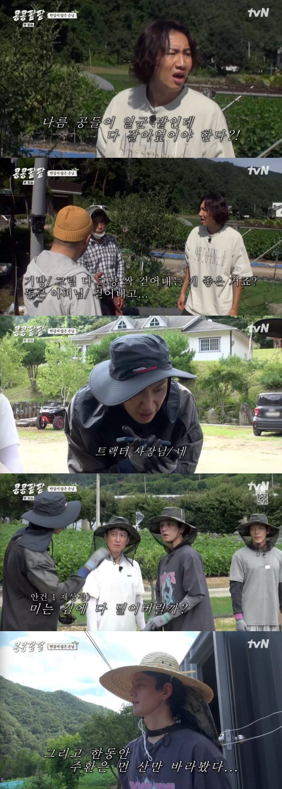 27일 오후 방송된 tvN 예능 프로그램 '콩 심은 데 콩 나고 팥 심은 데 팥 난다'에서는 이광수·김우빈·김기방·정수교·임주환이 밭농사에 힘을 쏟는 모습이 그려졌다.