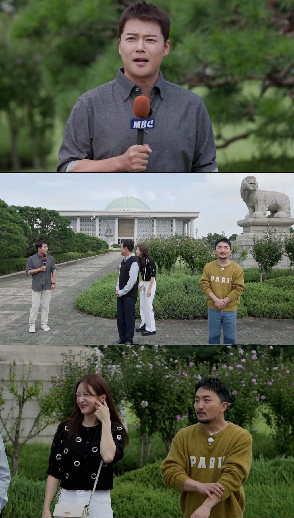 이런 가운데 공개된 사진 속 전현무는 국회 해태상 앞에 서서 브리핑을 하는 모습으로 눈길을 끈다. 한 손에 마이크를 쥔 채 등장한 전현무는 열심히 브리핑을 하다가 급 현실 자각 타임을 가진 모습도 보인다. 유병재는 멀찍이 서서 기자 전현무를 외면하고 있고, 하니와 역사학자 김재원은 신기한듯 구경을 하고 있어 웃음을 자아낸다.