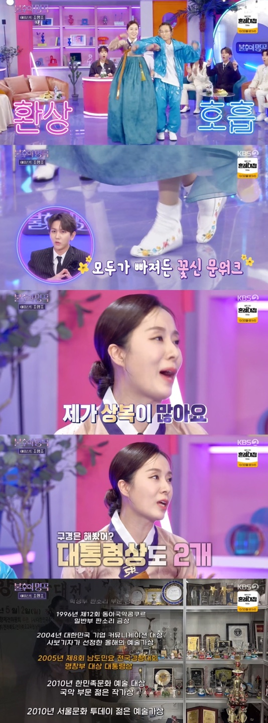 이어 MC 김준현은 "오늘 우승을 노릴 만하냐"라고 물었다. 이에 박애리는 "어쩔 수 없이 제가 상복이 많다. 대통령상도 2개나 갖고 있다"라며 상복 운을 빌미 삼아 우승을 기대한다고 털어놨다.