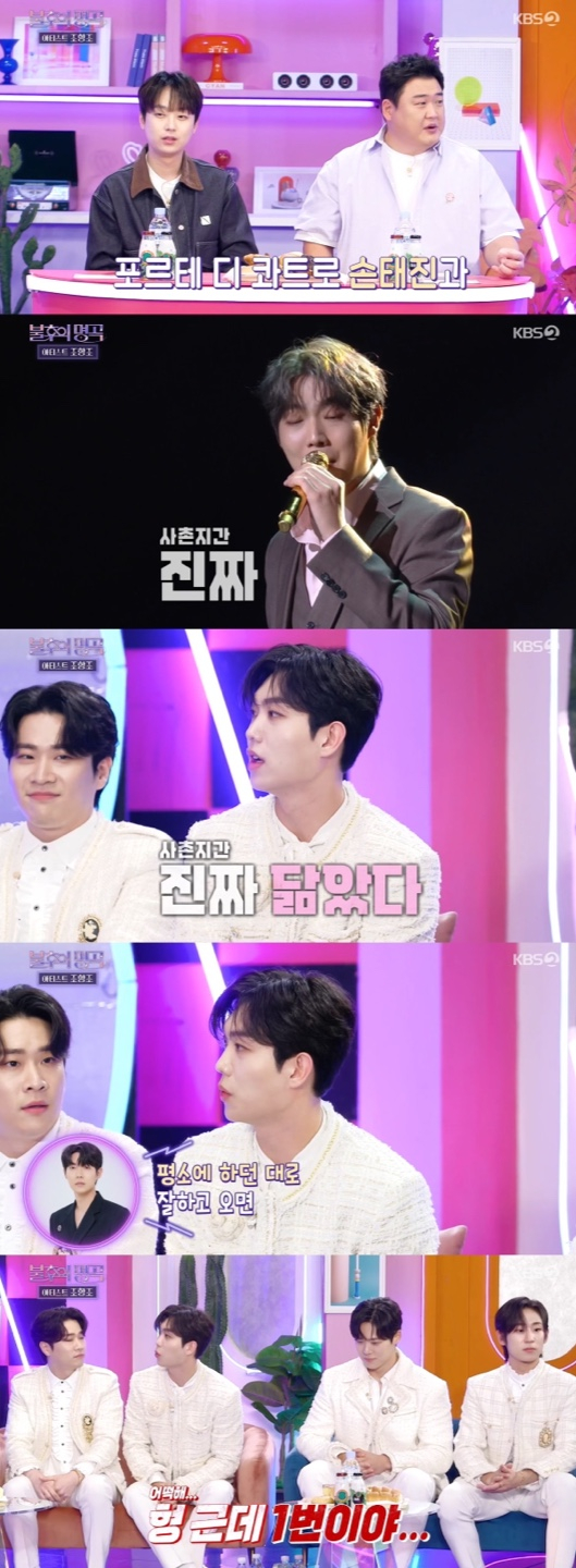 '불후의 명곡' 경험자인 손태진에게 조언이 있었냐는 MC 김준현의 질문에는 "'평소에 하던 대로 긴장하지 말고 잘하고 오면 좋은 결과 있을 거야'라고 했다. 그런데 형도 1번 순서가 나왔을지는 몰랐을 것"이라고 답해 보는 이들로 하여금 웃음을 자아냈다.
