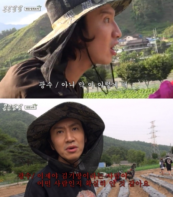 이광수는 예능 환경이 아무래도 낯선 김우빈, 도경수, 김기방을 위해 솔선수범해 예능감을 보여준다. 빠르게 치고 빠지면서 웃음을 심어놓는 토크, 제작진과 타협과 실랑이를 하며 밀당하는 상황극 등 예능 스킬이 SBS '런닝맨'의 짬바를 고스란히 입증해 나영석PD도 두 손 두 발 다 들게 만든다. '콩콩팥팥'에선 광수가 삽을 들자마자 삽이 부러지는 어처구니 없는 실제상황까지 예능신이 돕는데, 그 절정의 순간은 방울뱀이 나타났을 때다.