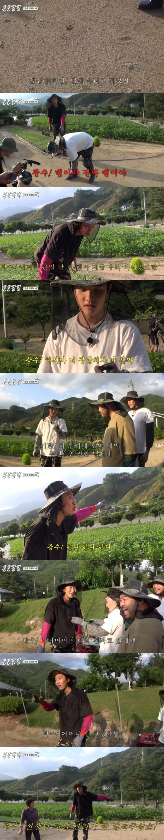 멤버들이 옆집 어머님에게 '밭 관리기'를 빌리러 갔을 때 도경수가 작은 뱀을 발견하자 이광수는 호들갑을 떨며 "뱀이에요 뱀!"이라고 소리쳐 시선을 사로잡았다. 옆집 어머님이 "지렁이에요"라고 했지만 이광수는 "뱀이에요 보세요 어머니"라며 온 동네에 "진짜 뱀이야!"라고 소리쳤다. 도경수가 뱀을 손으로 잡자 이광수는 "뱀이잖아 입 벌리잖아"라며 또 온동네 사람들이 듣도록 "방울뱀!"이라고 확성기 역할을 자처하곤 "어머니 큰일 날 뻔 했어. 지금 우리 아니었으면"이라고 너스레를 떨었다.