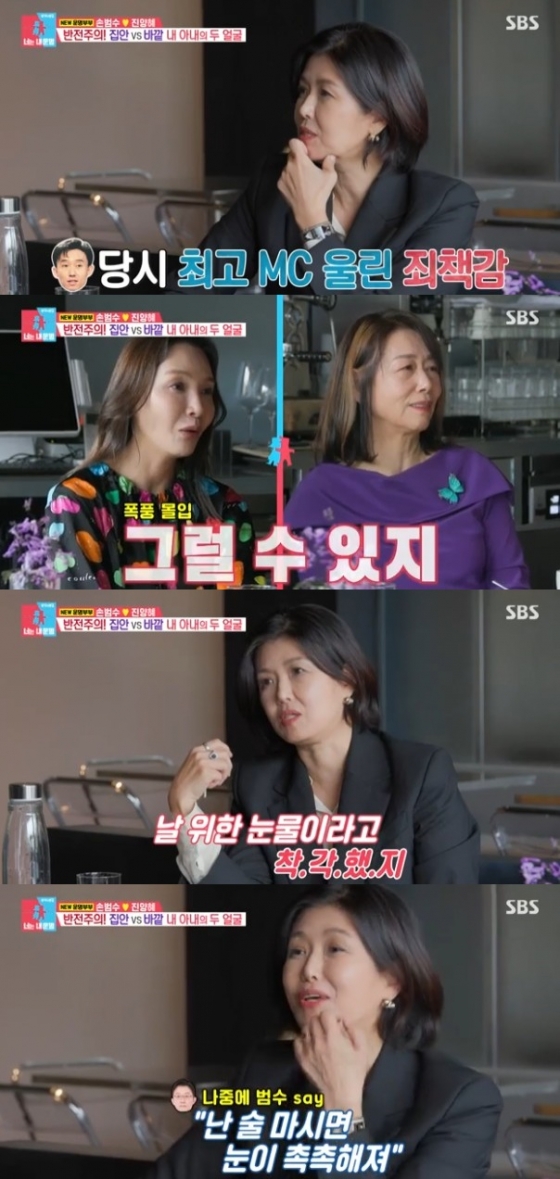 진양혜는 "저한테 결혼하자고 해서 '선배님 결혼 할 수 없어요. 저 일해야 해요. 헤어져요'라고 했는데 맥주를 마시다 놓고 보니 (손범수 씨 눈에) 눈물이 그렁그렁하더라. 그래서 '내가 뭐라고. 더군다나 대한민국 잘 나가는 MC를 눈물짓게 하다니'라는 생각이 들어 집에 오면서 마음이 너무 아팠다. 날 위한 눈물이라고 착각했다. 근데 나중에 손범수 씨가 자기는 술 마시면 눈이 그렇게 된다고 하더라"며 반전 이야기로 웃음을 안겼다.
