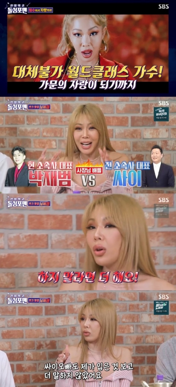 이날 방송에서 제시는 '지금 소속사 대표인 박재범이 더 좋냐, 전성기를 함께했던 전 소속사 대표 싸이가 더 좋냐'는 질문에 "둘 다 싫어"라고 질색하며 소리쳐 웃음을 자아냈다. 이어 그는 "그냥 인간적으로 박재범이 더 좋다. 둘 다 좋은데 어쩔 수 없다"며 "싸이 오빠는 나이가 있으니까 경험이 많다. 그냥 하라고 하니까 해야 한다. 박재범은 친구였다가 회사를 같이 하니까 싸운다"고 설명했다.