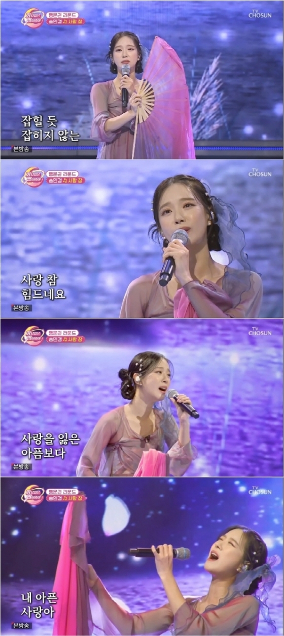 장윤정의 '사랑 참'을 선곡한 송민경은 "홍자님이 부른 '사랑 참'을 듣고 펑펑 울었다. 그래서 선곡하게 되었다"라며 무대를 시작했다. 우아하면서도 몽환적인 부채춤으로 시선을 사로잡은 송민경은 첫 소절부터 특유의 음색으로 감탄을 자아냈고 후렴구에서는 무대를 찢어버릴 듯한 칼 같은 고음으로 모두를 놀라게 만들었다.
