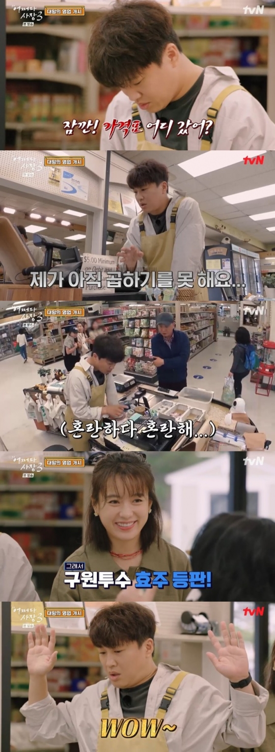 2일 방송된 tvN 예능 프로그램 '어쩌다 사장3' 2화에는 미국 한인 마트 '아세아 마켓' 영업 첫날 '사장즈' 차태현과 조인성, '알바즈' 한효주, 임주환, 윤경호의 모습이 공개됐다.