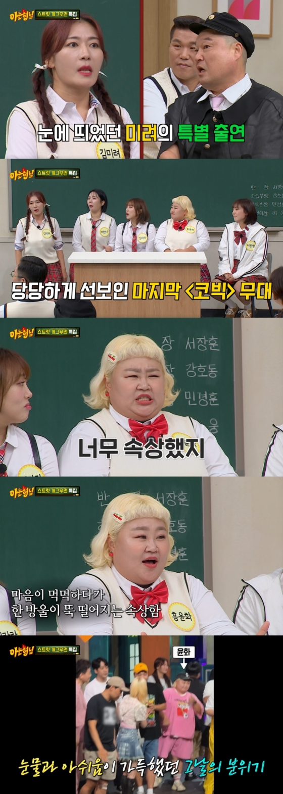 서장훈은 '코빅' 종방 소식을 들었을 때 기분이 어땠냐고 물었다. 가장 먼저 홍윤화는 "너무 속상했다. 뭔가 눈물이 팍 터지는 속상함보다 먹먹했다. 설거지하다가 눈물이 뚝 떨어졌다. 마지막 녹화 때 아무렇지도 않다가 객석을 봤는데 자주 오던 관객분이 휴대폰에 '그동안 너무 고마웠어요'라고 써서 보여주더라. 갑자기 울컥해서 울었다"라며 씁쓸해했다.