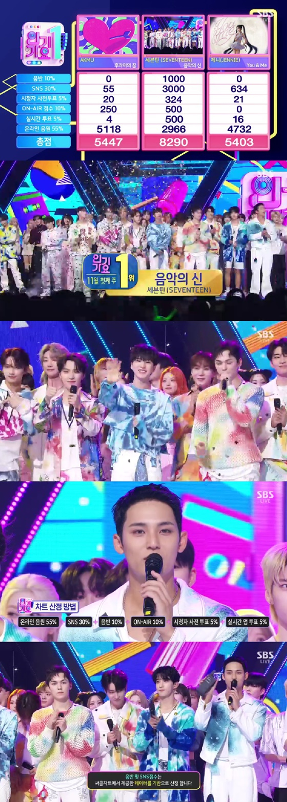 5일 방송된 SBS '인기가요'에서는 세븐틴이 신곡 '음악의 신'으로 악뮤의 '후라이의 꿈', 블랙핑크 제니의 '유앤미'를 꺾고 11월 첫째 주 1위를 차지했다.