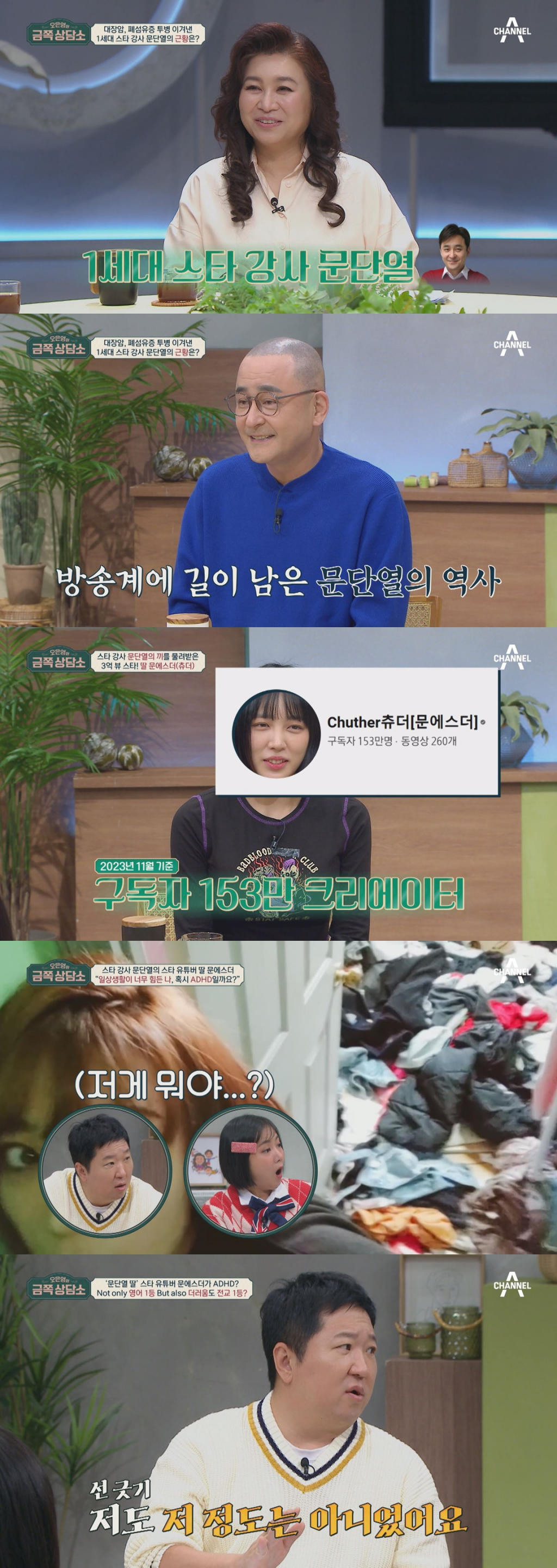 7일 오후 8시 10분 방송 예정인 채널A '오은영의 금쪽 상담소'에 1세대 스타강사 문단열과 150만 유튜버 '츄더'로 활동 중인 딸 문에스더가 찾아온다.