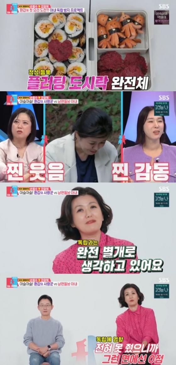 이어 산책로에 도착한 두 사람은 신발을 벗고 맨발로 걷다 운동기구가 있는 곳에 멈춰 섰다. 손범수는 운동기구에서 몸을 풀다 이제 내려가자는 진양혜를 벤치에 앉혀 후배 아나운서들과 만들었던 도시락을 꺼내 보였다. 진양혜는 남편의 낯선 이벤트에 당황한 듯했으나 아기자기한 도시락이 공개되자 웃음꽃을 피웠다. 진양혜가 잘 만들어진 도시락 모양에 놀라 "한석준이 만든 것 아니냐"고 의심하자, 손범수는 "아니다. 석준이 걔는 한 게 없다. 자식 입만 살았다"며 너스레를 떨어 웃음을 안겼다.
