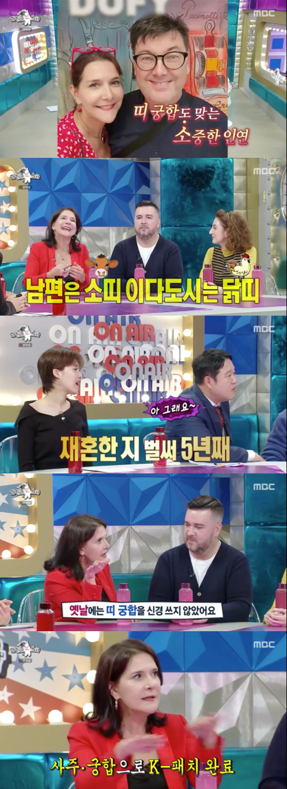 이다도시는 띠 궁합 덕에 부부가 됐다며 "남편은 소띠고 저는 닭띠다. 전 남편은 호랑이 띠였다. 전에는 이런 거 신경 쓰지 않았다. 근데 남편이 자기가 소띠라니까 호감이 생기더라"며 '대한 외국인'의 면모를 보여 폭소를 유발했다.