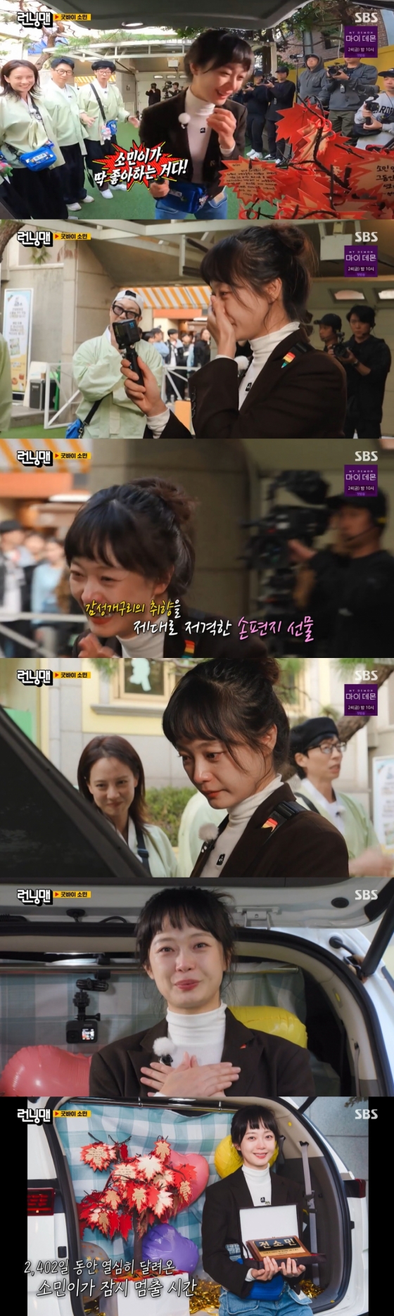 지난 12일 오후 방송된 SBS '런닝맨'에서는 '전지적 소민 시점 - 굿바이 소민' 레이스로 진행돼 전소민을 향해 특별한 선물을 준비하는 유재석, 지석진, 김종국, 하하, 송지효, 양세찬의 모습이 그려졌다.