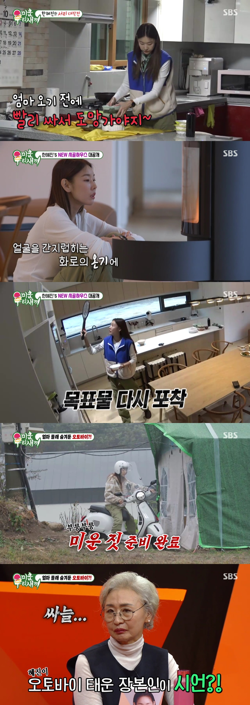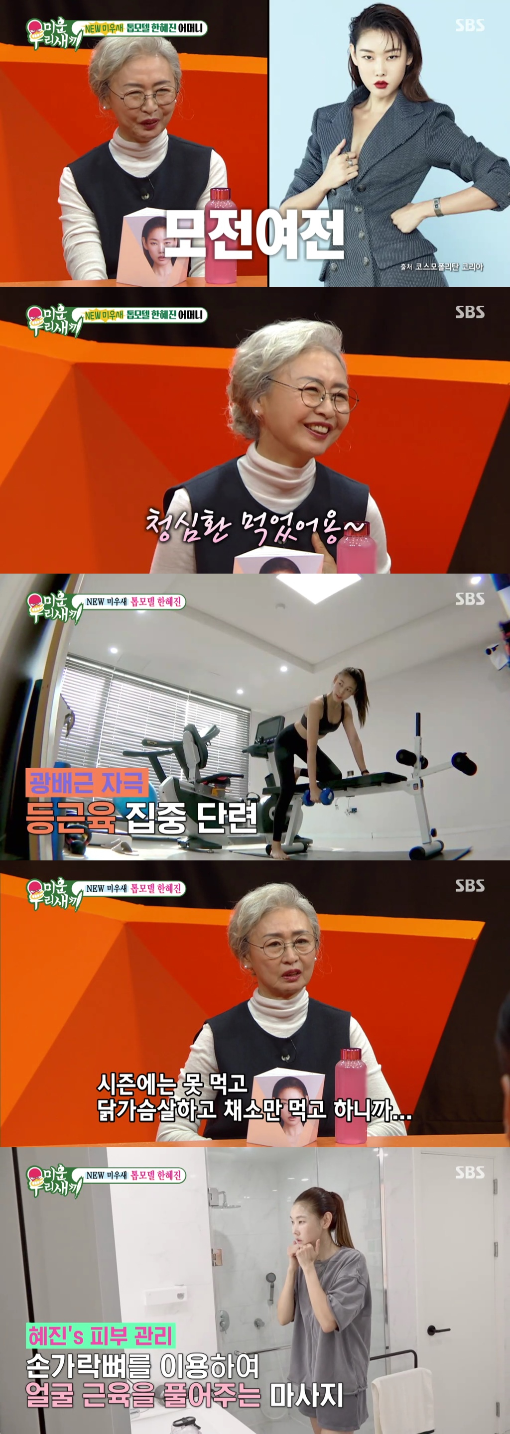 대한민국 톱모델, 모델계의 살아있는 전설 한혜진이 'NEW 미운 우리 새끼'로 합류했다.김종국과 비슷하게 최고의 운동기구를 완비한 운동 룸에서 한혜진은 자신만의 운동 루틴을 선보였고, 강도 높은 운동에 母벤져스는 입을 다물지 못했다. 혜진 母는 "나는 눈물 난다. 마음이 아프다"라며 관리가 일상이 되어버린 딸을 안쓰러워하며 눈물을 글썽였다. 이어 한혜진은 뷰티 케어 루틴을 시작했다. 부항기를 이용해 허벅지 셀룰레이트를 관리하고, 얼굴 경락 마사지로 V라인을 관리하는 혜진에게서 母벤져스 모두가 역대 최고 집중력을 발휘하며 눈을 떼지 못하는 모습에 폭소가 터져 나왔다. 톱모델의 어머니답게 47kg의 날씬한 몸무게를 고백해 모두를 놀라게 한 혜진 母는 "혜진이가 모델 시작했을 때부터 나도 관리를 시작했다"라며 남다른 딸 사랑 면모를 드러냈다.