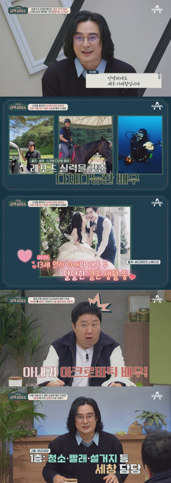 MC 박나래는 이세창이 골프, 승마, 스쿠버다이빙부터 카레이싱까지 섭렵한 만능 레포츠인이라고 소개하며, 13살 연하의 아내 또한 남다른 능력의 소유자라고 덧붙인다.