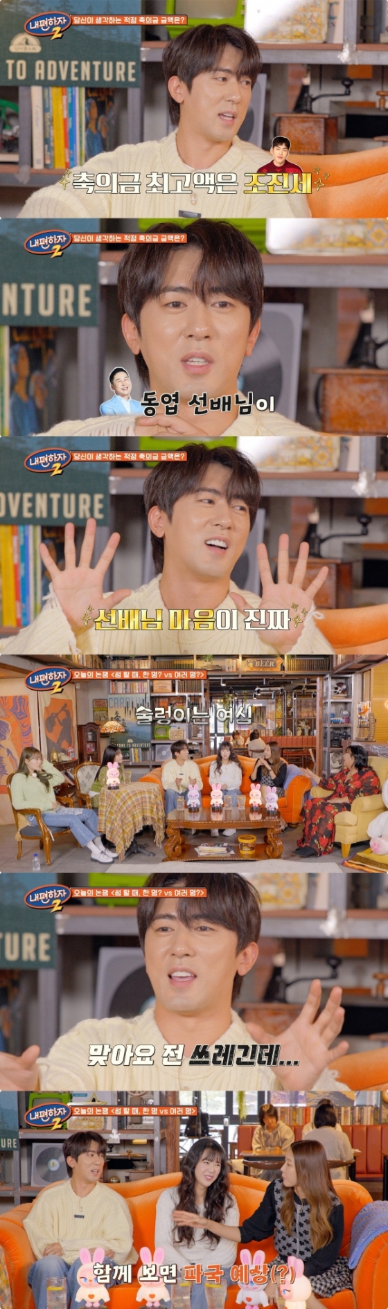 "요즘 밥값이 비싸다", "기본 5만 원 시작이다", "10만 원은 해야 한다"는 등 적정액에 대해 의견을 주고받는 가운데 출연진 중 유일한 기혼자인 김원훈은 개그 파트너이자 절친인 조진세가 최고액인 500만 원을 냈다고 해 모두를 놀라게 했다.