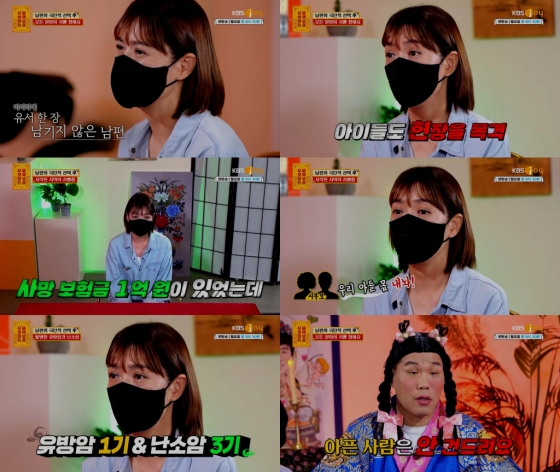 엎친 데 덮친 격으로 남편이 떠나고 1년 반 뒤 사연자는 유방암 1기, 난소암 3기 판정을 받고 암 수술 후 항암치료를 진행 중이고 아이들도 비슷한 시기 크론병이라는 희귀난치성 질환을 진단받았다며 "사망 보험금으로 병원비를 감당하며 식당 설거지 알바로 생계유지만 간신히 하고 있다"라는 사연자의 이야기를 듣고 두 보살은 안쓰러움에 말문이 막히기도 했다.