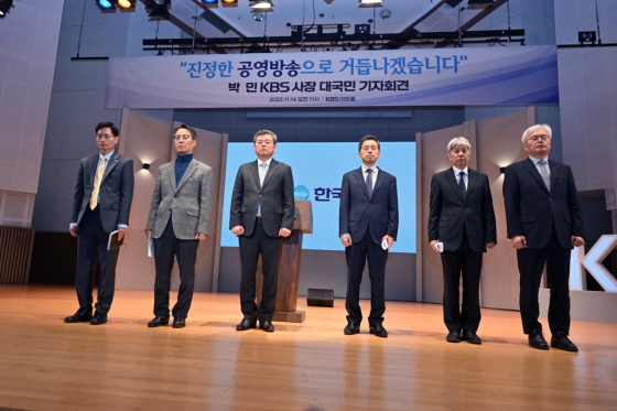 박 사장은 14일 서울 여의도 KBS 신관에서 대국민 기자회견을 진행했다. 이날 박민 사장을 비롯해 이춘호 전략기획실장, 김동윤 편성본부장, 장한식 보도본부장, 임세형 제작 1본 부장, 조봉호 경영본부장 등이 참석했다.
