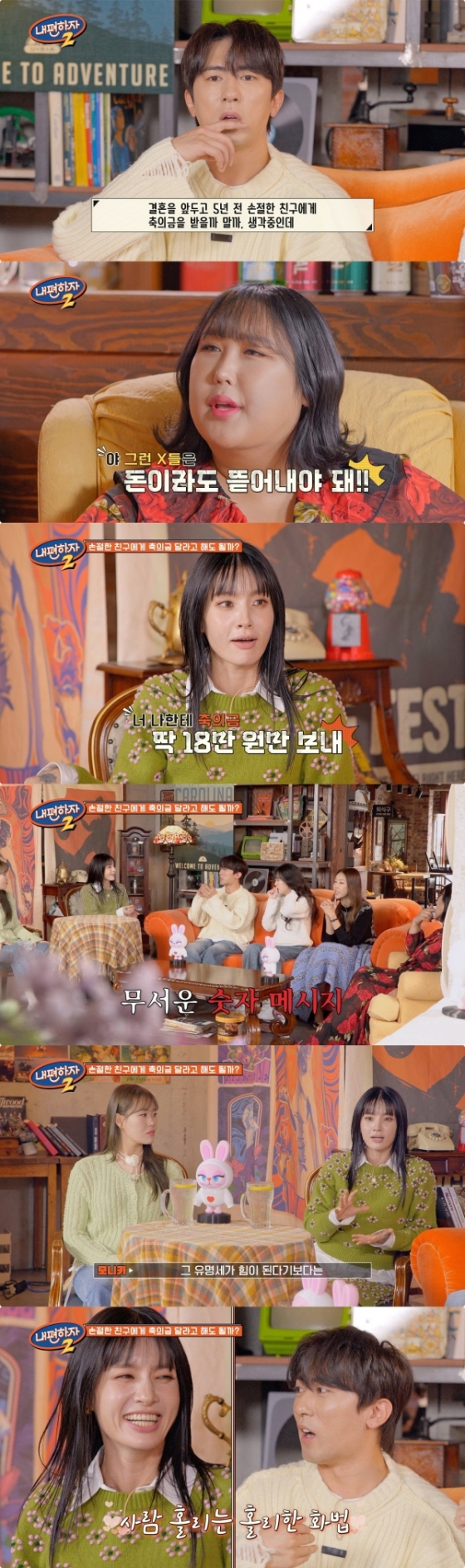 14일 LG U+모바일TV 오리지널 예능 '믿고 말해보는 편-내편하자' 시즌2(이하 '내편하자2') 측에 따르면 오는 15일 방송에서는 5년 전 '손절'한 친구에게 축의금을 받을지 말지 고민하는 예비 신부의 사연이 소개된다.