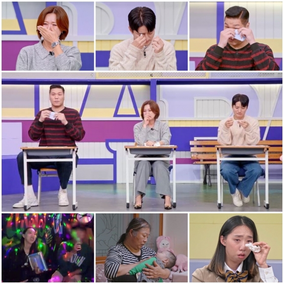 '고딩엄빠4' MC 박미선과 인교진, 서장훈이 '청소년 엄마' 오현실의 속사정을 알게 된 후 눈물을 쏟는다.