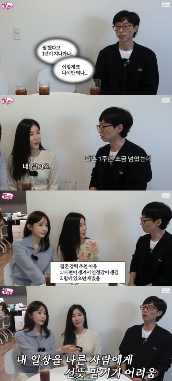 이어 유재석은 이해리의 결혼을 언급하며 "지난해 더울 때 결혼식에 갔다. 결혼 1주년 넘었는데 어떻냐"고 물었고, 이해리는 "저는 너무 좋다. 강추(강력히 추천)한다. 내편이 생겨서 안정감이 생기고, 함께 있으면 웃기고 재밌다"고 말했다.