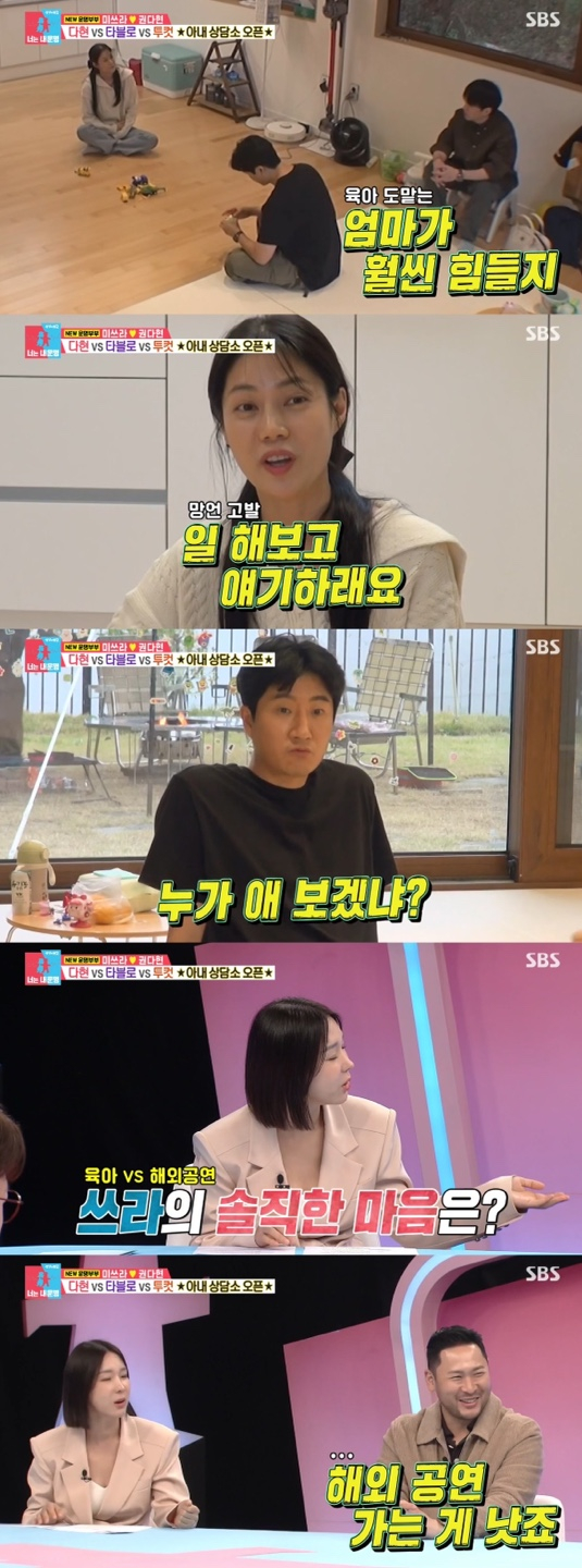 투컷 역시 "일하는 게 훨씬 낫다"라고 답했다. 그러면서 "누가 나한테 '아기 볼래? 해외 가서 공연할래?'하면 누가 애 보겠다고 하겠냐"라고 덧붙였다. 이에 권다현은 "그런데 남편은 나한테 '난 네가 해외 나가서 일해봤으면 좋겠다'라며 '해외 가서 일해봐라'라고 얘기한다"라고 미쓰라를 폭로했다. 이에 타블로는 "진짜 말을 그렇게 했냐. 우리랑 같이 있을 땐 네가 훨씬 힘들 거라고 생각하던데"라며 권다현을 위로하면서도 같은 멤버인 미쓰라를 지켜주려는 모습을 보였다.