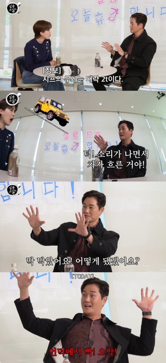이에 유지태는 "그리고 어떻게 됐겠냐. 짜부라질 뻔했다. 죽을 뻔 했다"고 덧붙여 충격을 안겼다. 이어 그는 "언덕에서 '으악'했다. 나는 내가 힘이 셀 줄 알았다"고 당시를 회상했다. 이에 장도연은 "못 본 사이에 위트가 늘었다"며 "지프 때문에 '찌부' 될 뻔했다"고 너스레를 떨어 웃음을 자아냈다.