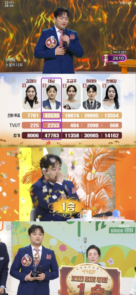 가수 태남이 '아침마당'의 '도전 꿈의 무대' 노래 대결에서 1승을 했다.