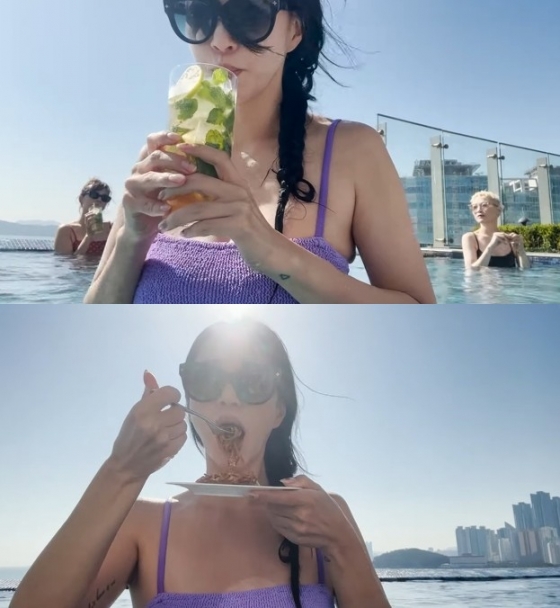 배우 한예슬이 호텔 루프탑에서 수영복을 입고 여전한 미모를 뽐내며 짜장 라면 '먹방'을 선보였다.