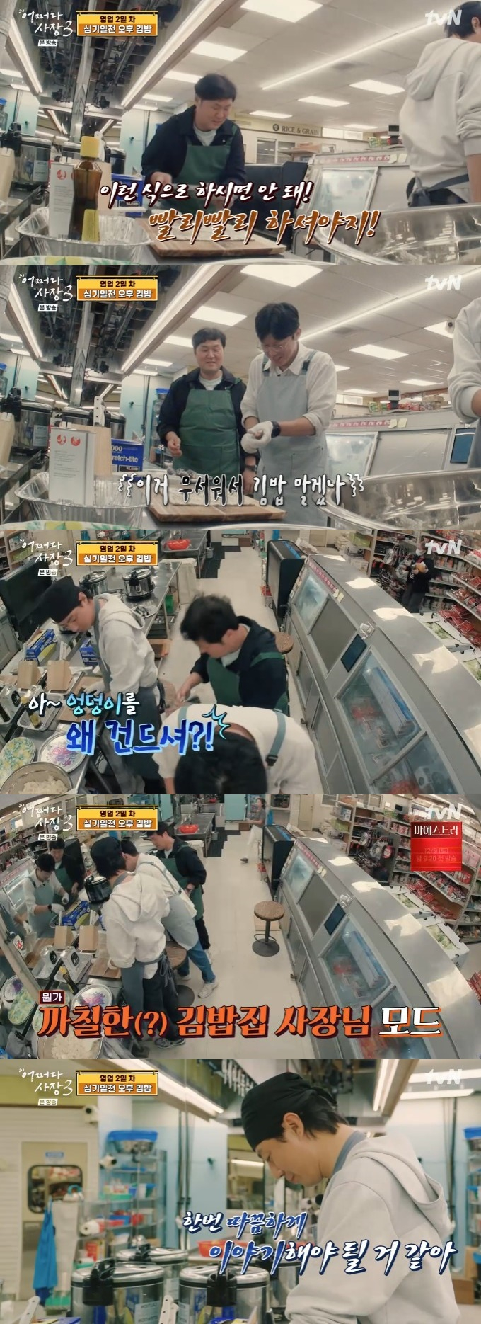 계속 김밥 코너를 담당해왔던 윤경호는 "계속 말아 주세요. 래핑해 주셔야지. 내가 맨손으로 어떻게 해"라며 김밥 코너 신입인 박병은에 훈수를 뒀다. 그러면서 윤경호는 "왜 이렇게 어리바리해. 이런 식으로 하시면 안 돼요. 빨리빨리 하셔야지"라고 잔소리를 늘어놓았다.