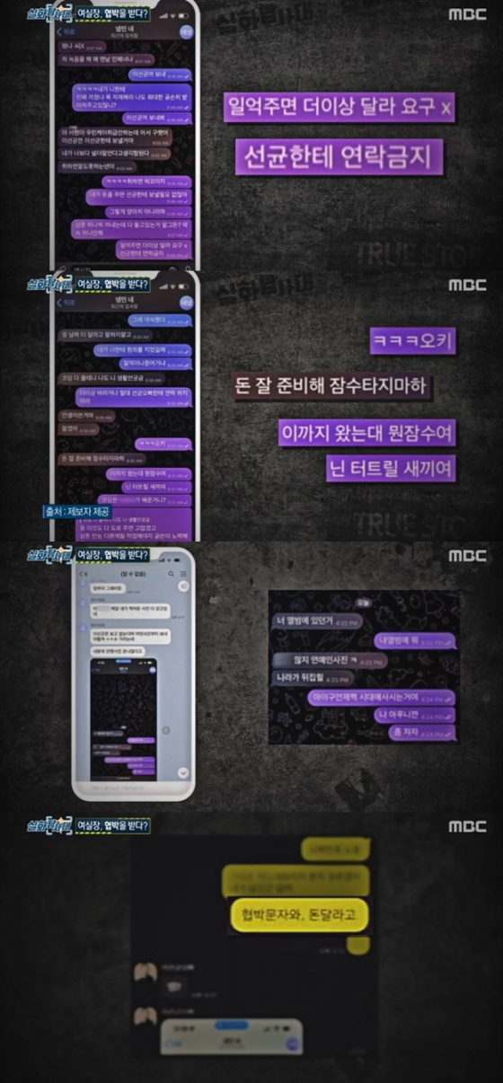 '실화탐사대'가 입수한 문자 내용에 따르면 A씨는 "나라가 뒤집힐 연예인 사진 많지"라는 해킹범의 협박에 "아이고 언제적 시대에 사시는 거야. 나 아프니깐 좀 자자"라고 말했다. '실화탐사대' MC 아나운서 서인은 "협박을 당하고 있는데 '잠 좀 자겠다'니 상식적으로 이해가 되지 않는다"고 지적했다. 박지훈 변호사는 "굉장히 기묘하다. 어디까지 믿어야 할지 모르겠지만, 좀 과장하고 있는 게 아닌가 생각이 든다"고 전했다.