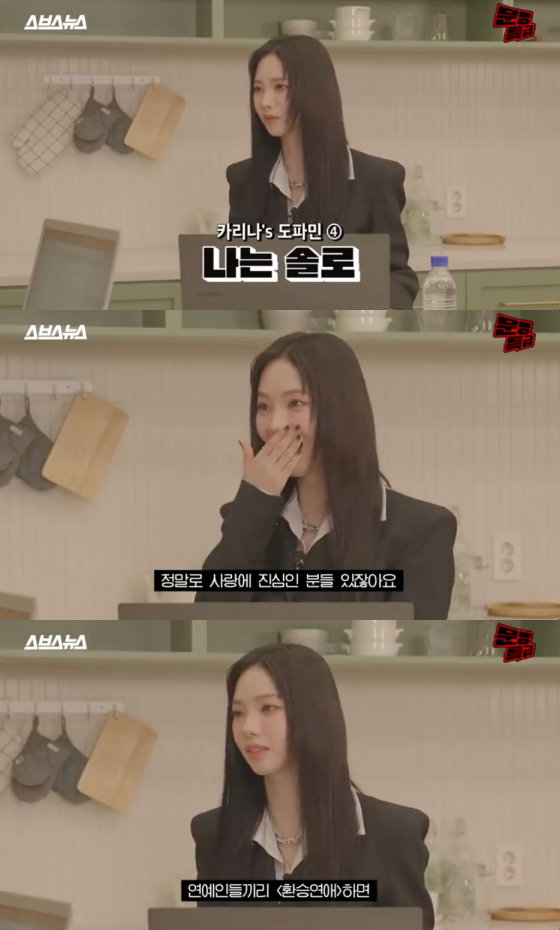 카리나는 이어 "릴스가 '환승연애'고 쇼츠가 '하트시그널'이면 틱톡이 '나는 솔로'다. 도파민의 끝이다"며 ENA·SBS플러스 예능 프로그램 '나는 솔로'에 빠졌다고 밝혔다.