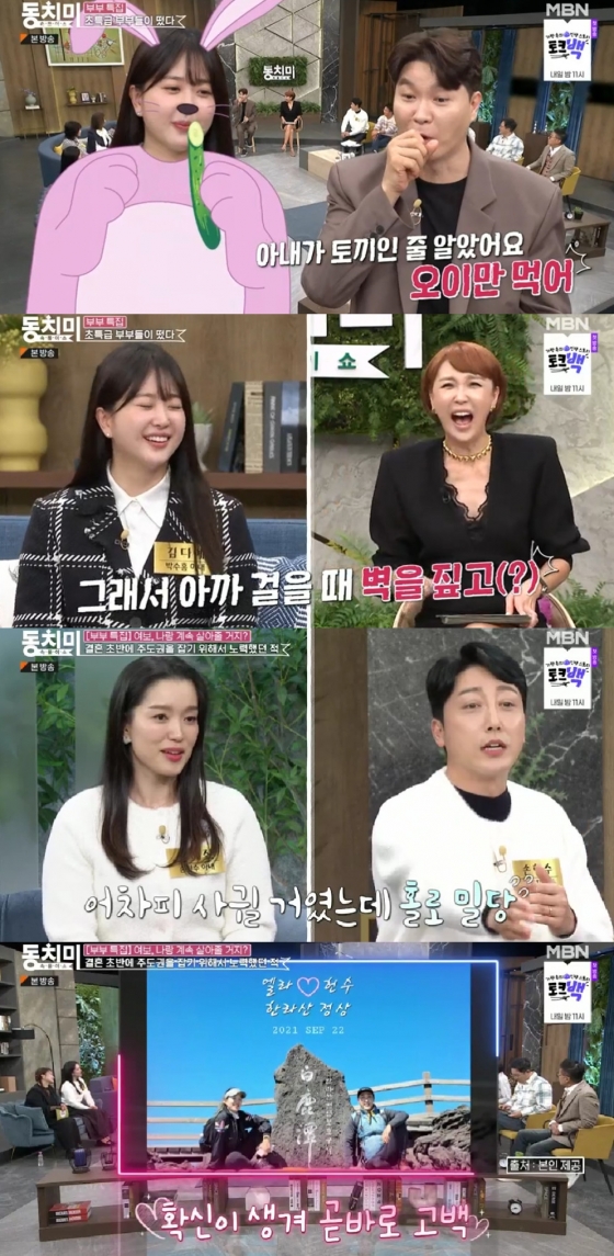 또한 최근 결혼한 손헌수, 송혜진 부부가 출연했다. 송혜진은 "결혼한다고 하니까 주변에서 초장에 잡아야 한다고 하더라. 초반에 기 싸움을 해야 한다고 했는데 주도권에 대해서 생각할 필요가 없는 게 남편이 기본적으로 배려심 있고 세심하다"라며 "제가 먼저 고백했고, 그 당시 남편의 상황이 안 좋았는데 이 사람을 다 해주고 싶다는 생각이 들었다. 주도권을 잡고자 하는 마음은 없었다"고 밝혔다.