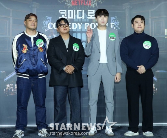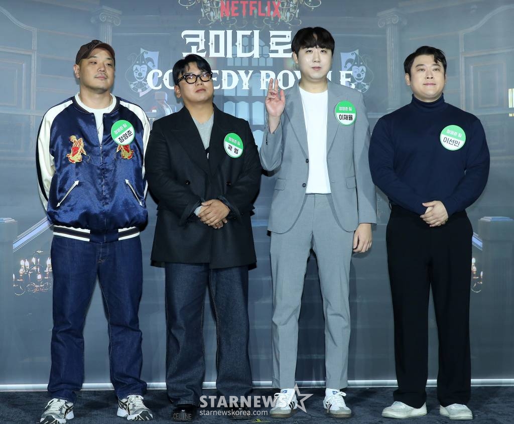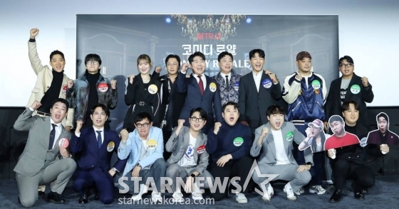27일 서울시 성동구 메가박스 성수에서 넷플릭스 예능 '코미디 로얄' 제작발표회가 열린 가운데, 권해봄 PD, 박현석 PD, 개그맨 이경규, 탁재훈, 이용진, 황제성, 이상준, 곽범, 이창호, 엄지윤, 김두영, 신규진, 최지용, 정영준, 이선민, 조훈, 이재율, 박진호가 참석했다.
