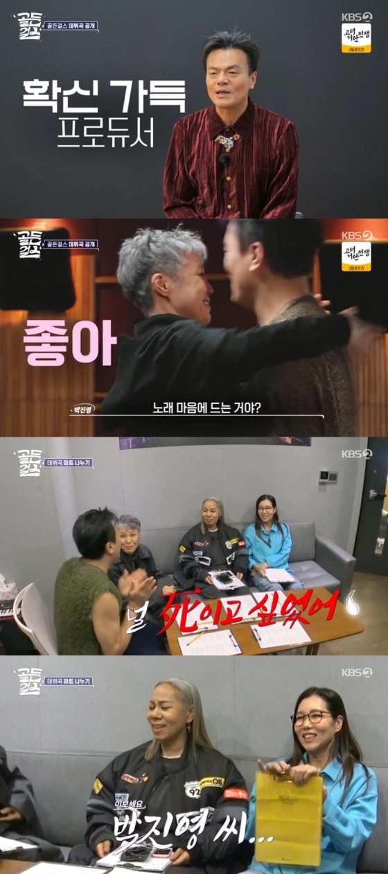 박진영은 칭찬에 안도하며 "누나들 키로 녹음하고 다음 날 목소리가 안 나왔다. 마지막에 제일 높은 음은 겨우 녹음했다. 가성으로 부르기 싫어서 악착같이 불렀다. 누나들은 고음을 낼 수 있길 원한다"고 말했다.