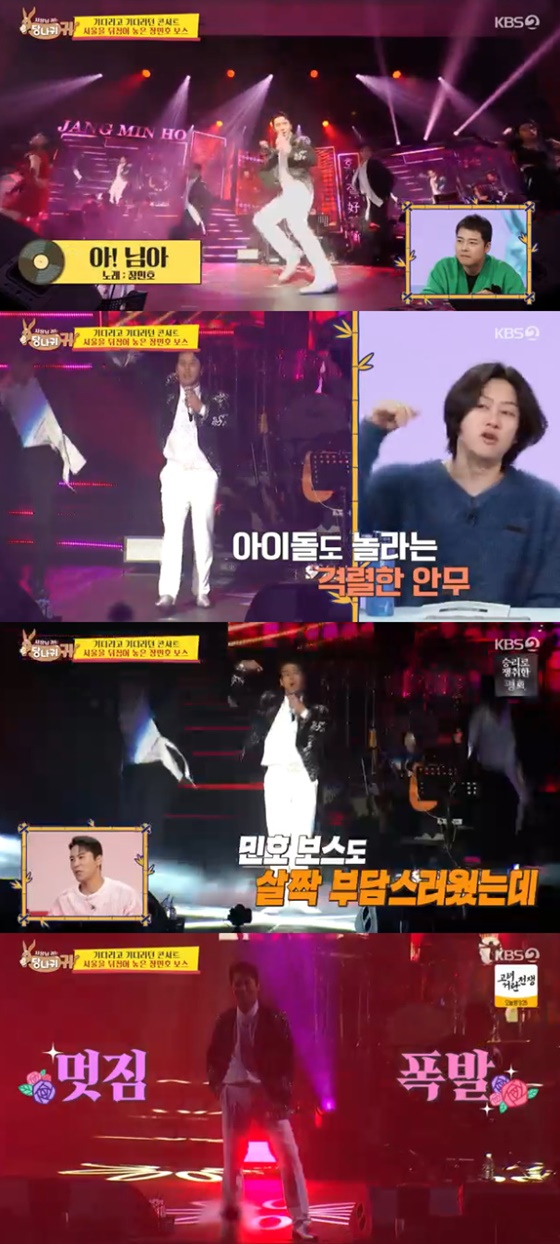 스튜디오에서 장민호의 콘서트 현장이 담긴 VCR 영상을 지켜보던 그룹 슈퍼주니어의 김희철은 "춤이 너무 보이그룹"이라고 말했다.